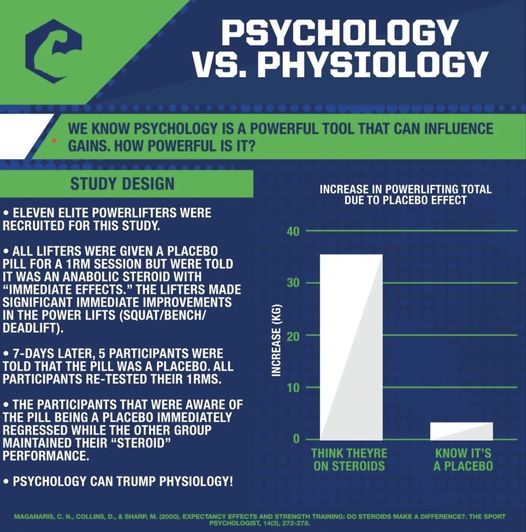 一篇兩千年的研究招募了7名力量舉運動員,並測試他們1R M的重量,在試舉之前給他們一顆維他命,並告知他們這是超級速效的類固醇,像美國隊長吃的那一種,在試舉之後,每個人的三大項成績都進步了;幾天之後其中五名運動員被告知那一顆藥丸只是維他命而已,然後再測一次他們的1R M成績,那五名運動員成績都退步了,但剩餘的兩名成績還是維持進步後的成績。