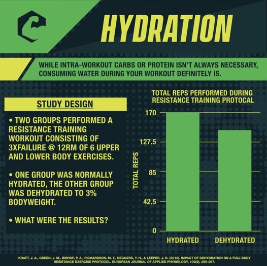 一篇2010的研究,將受試者分為2組,一組補充足量水分,一組人則輕微脫水(3%),總共執行6組上下肢的運動,結果不論是反覆的次數、自覺費力程度、心跳恢復速度,輕微脫水組都明顯表現比較差,這篇研究可以讓我們很容易地了解到喝足夠的水分,特別是運動期間有多麼的重要,那麼,你今天拿起水瓶裝水了嗎?